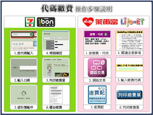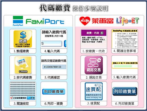 2. 全家 FamiPort / 萊爾富Life ET 代碼繳費 詳細操作步驟如下圖